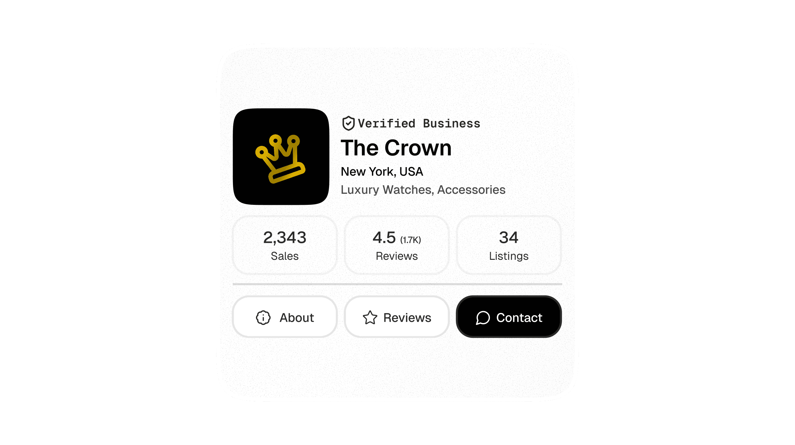 Your reputation, history, and verified status — one profile, everywhere you trade. Built once, travels forever.